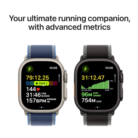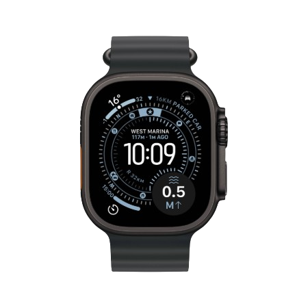 The Apple Watch Ultra 3 GPS + Cellular 49mm (Black Titanium) – Built for extreme performance with a rugged Black Titanium case, advanced health & safety features, dual-frequency GPS, and up to 36 hours battery life. Comes with Black Ocean Band, Black Alpine Loop, or Black/Charcoal Trail Loop options.