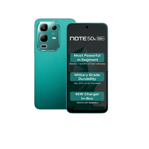 The Infinix Note 50X 5G Plus features a 6.78" FHD+ 90Hz display, Dimensity 920 processor, 48MP dual rear cameras, and a 5000mAh battery with 33W fast charging. It offers dual stereo speakers, a side fingerprint sensor, and runs on Android 12 (XOS 12). Available in Ench Purple, Sea Green, and Titanium Grey.