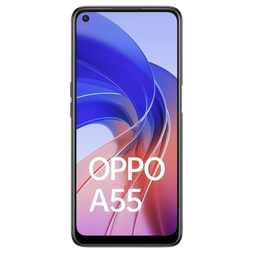 The Oppo A55 (4GB/64GB) features a 6.51-inch HD+ display and is powered by the MediaTek Helio G35 processor. It has a 50MP triple rear camera and a 16MP front camera. The phone is backed by a 5000mAh battery with 18W fast charging and runs on ColorOS 11.1 (Android 11). Available in Rainbow Blue, Starry Black, and Mint Green colors.