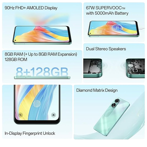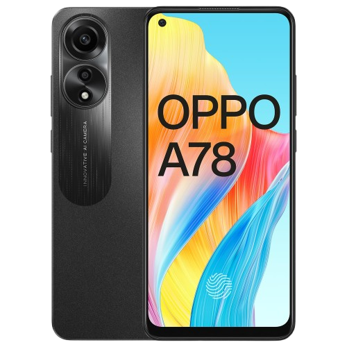 The Oppo A78 has a 6.56-inch HD+ display with 90Hz refresh rate. Powered by MediaTek Dimensity 700, it features a 50MP dual rear camera, 8MP front camera, and a 5000mAh battery with 33W SUPERVOOC charging. It offers 8GB RAM, 128GB storage (expandable), and runs on Android 13. Available in Mist Black and Aqua Green.