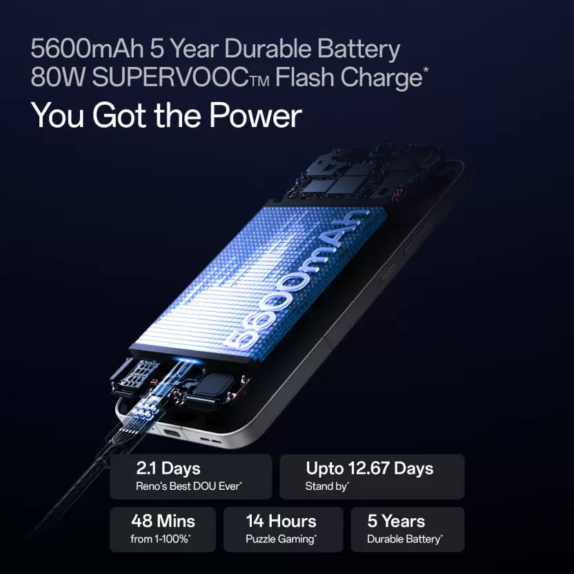 Oppo Reno 13 5G features a 6.7" 120Hz AMOLED display, Dimensity 8200 processor, 50MP AI triple-camera, 4800mAh battery with 67W fast charging, and ColorOS (Android 14) for a smooth experience. Available in Ivory White and Luminous Blue. 📱✨