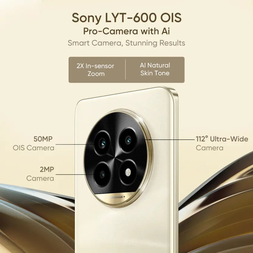 ✨ realme 14 Pro Lite 5G in stunning Glass Gold packs power and style with a 6.7″ curved OLED 120Hz display, Snapdragon 7s Gen 2, 8GB RAM + 128GB storage, 50MP OIS camera, 32MP selfie lens, and a long-lasting 5200mAh battery with 45W fast charging — all running on Android 14 with Realme UI 5.0.