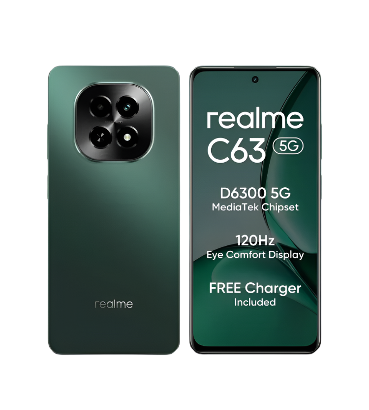 Realme C63 5G – A stylish and powerful smartphone featuring a 6.72-inch FHD+ display, 50MP AI camera, and 5G connectivity. Powered by a MediaTek Dimensity 6100+ processor with 4GB/6GB RAM options for smooth performance. Equipped with a 5000mAh battery and 33W fast charging for all-day usage. Available in Jade Green, Starry Gold, and Forest Green.🚀📱