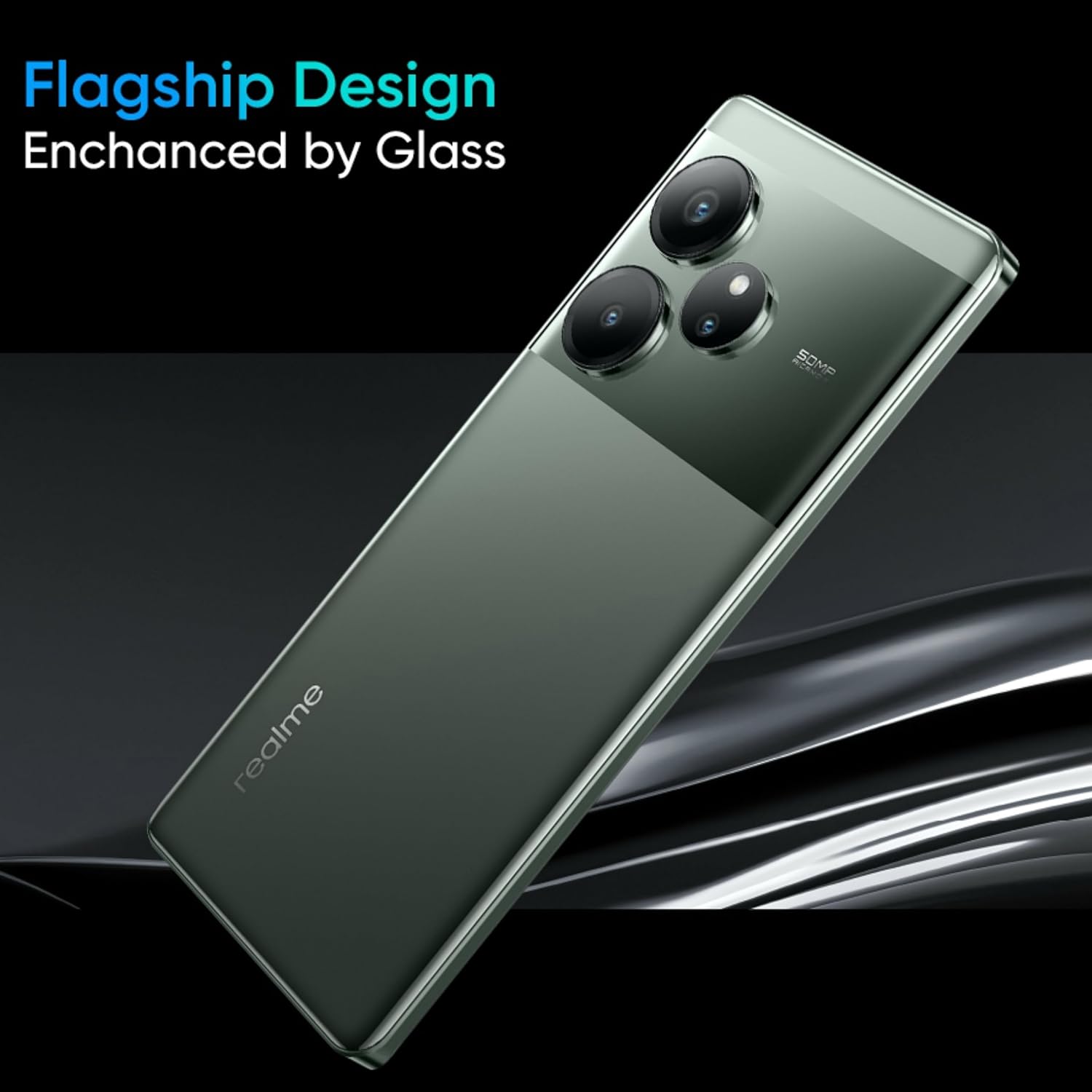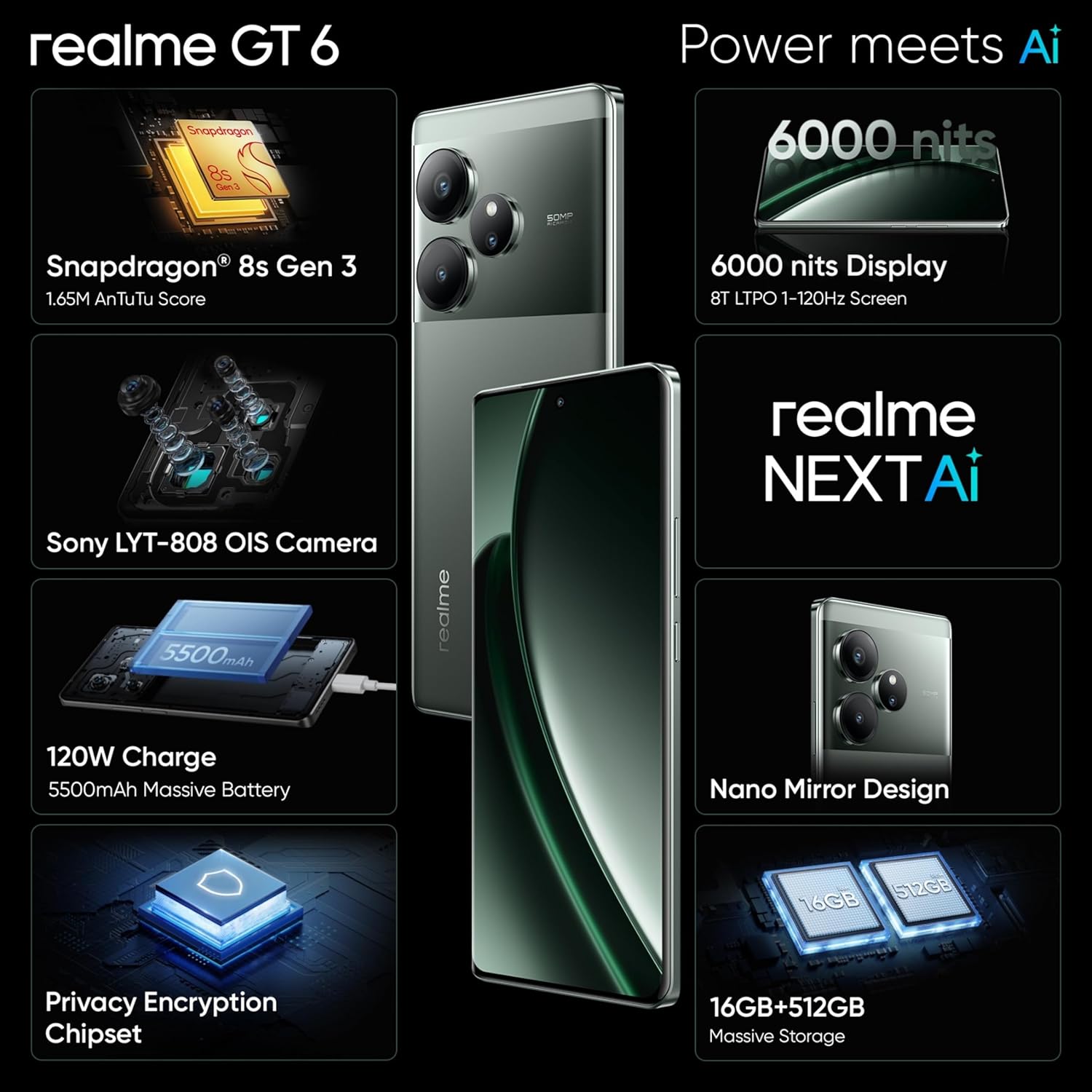 The Realme GT 6 5G (Fluid Silver / Razor Green) features a 6.74-inch AMOLED display, Snapdragon 8 Gen 2 chipset, 50MP AI triple-camera setup, 4600mAh battery with 100W SuperVOOC charging, and runs on Realme UI 5.0 based on Android 13.