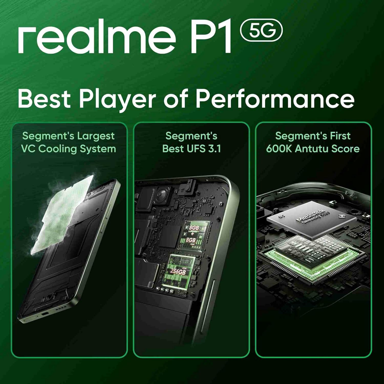 The Realme P1 5G (8GB/256GB) in Peacock Green features a 6.67-inch AMOLED display with 120Hz refresh rate, MediaTek Dimensity 7050 processor, 64MP dual-camera, and a 5000mAh battery with 45W fast charging, offering powerful performance and vibrant visuals!