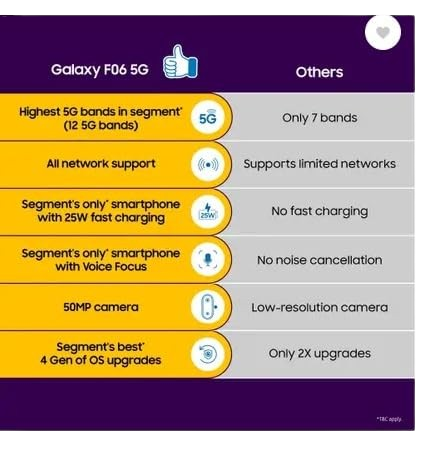 The Samsung Galaxy F06 5G offers smooth everyday performance with a 6.5-inch HD+ display, 5G connectivity, and a powerful 5000mAh battery. With a 50MP dual camera and storage options of 4GB/128GB or 6GB/128GB, it’s built for reliable and efficient use.