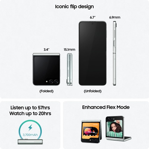 The Samsung Galaxy Z Flip 5 Mint is a stylish foldable smartphone with a compact design and a stunning 3.4" Flex Window cover screen. Powered by Snapdragon 8 Gen 2, 8GB RAM, and 256GB storage, it delivers fast performance and smooth multitasking. Capture amazing photos with its dual cameras and enjoy all-day battery life in a sleek, refreshing Mint finish.