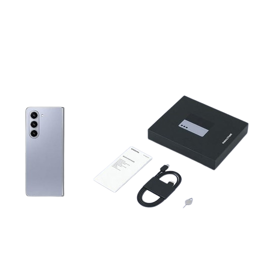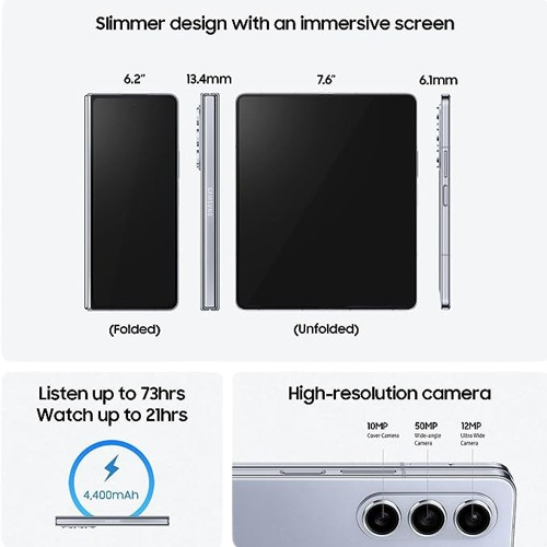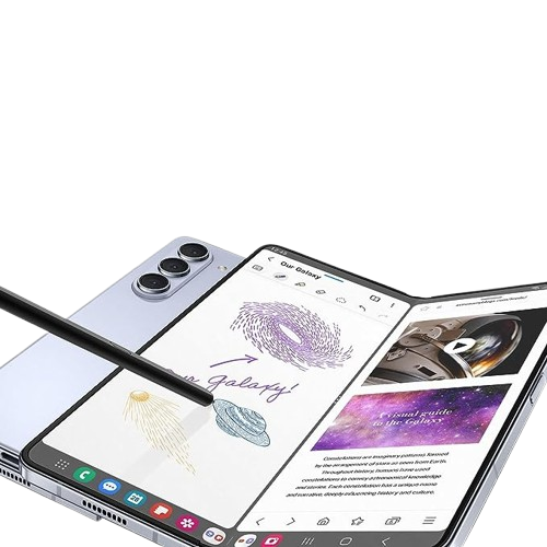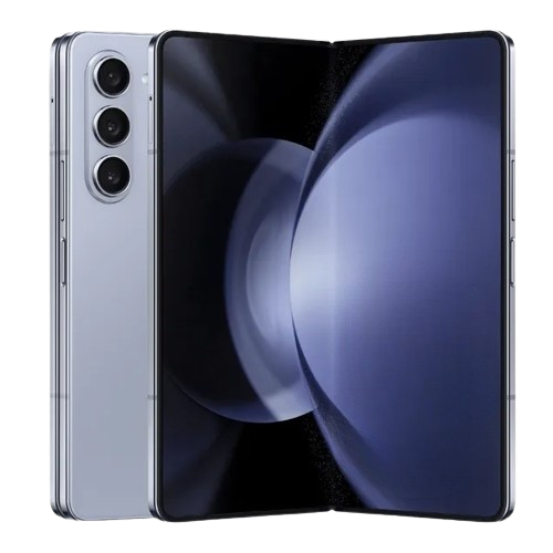 The Samsung Galaxy Z Fold 5 is a foldable smartphone with a 7.6-inch main display and a 6.2-inch cover screen, both featuring 120Hz Dynamic AMOLED 2X. Powered by the Snapdragon 8 Gen 2 processor, it offers 12GB RAM and 512GB storage. It has a versatile 50MP triple rear camera, a 10MP front camera, and a 4MP under-display camera. The device is IPX8 water-resistant, supports 5G, and features 25W fast charging with a 4,400mAh battery. Available in Icy Blue, Phantom Black, and Cream colors.