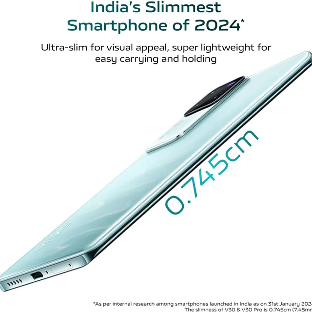 The Vivo V30 5G (8GB RAM, 256GB storage) features a 6.78" FHD+ AMOLED display with a 120Hz refresh rate for smooth visuals. Powered by the Snapdragon 7 Gen 3 chipset, it ensures efficient performance. The 50MP OIS rear camera and 50MP ultrawide camera deliver stunning photos, while the 50MP front camera captures clear selfies. Equipped with a 5000mAh battery and 80W FlashCharge, it charges quickly. Available in elegant Andaman Blue, Classic Black, and Peacock Green colors.