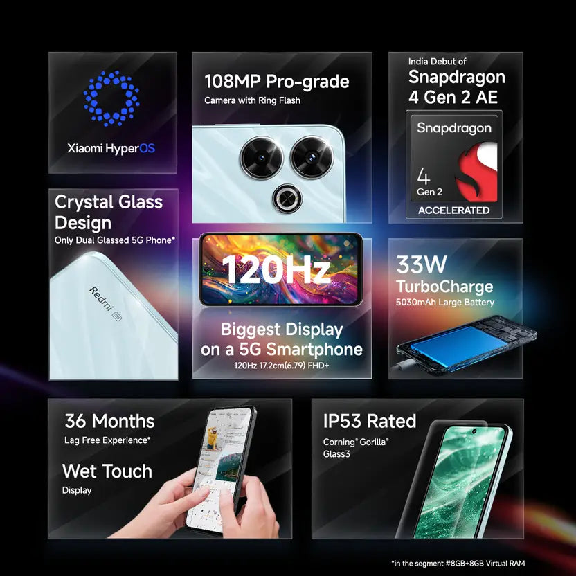 The Redmi 13 5G in Hawaiian Blue and Orchid Pink offers a vibrant 6.79″ FHD+ display, 108MP camera, Snapdragon 4 Gen 2 performance, and a 5030mAh battery for smooth everyday use.